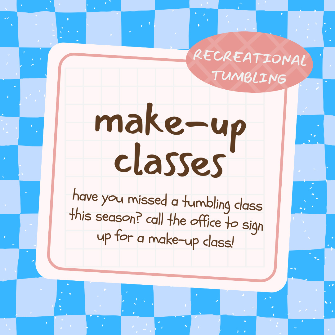 If your athlete missed a recreational tumbling class this season, they’re eligible for a make-up class. Classes are offered from 4-5pm and/or 5-6pm.