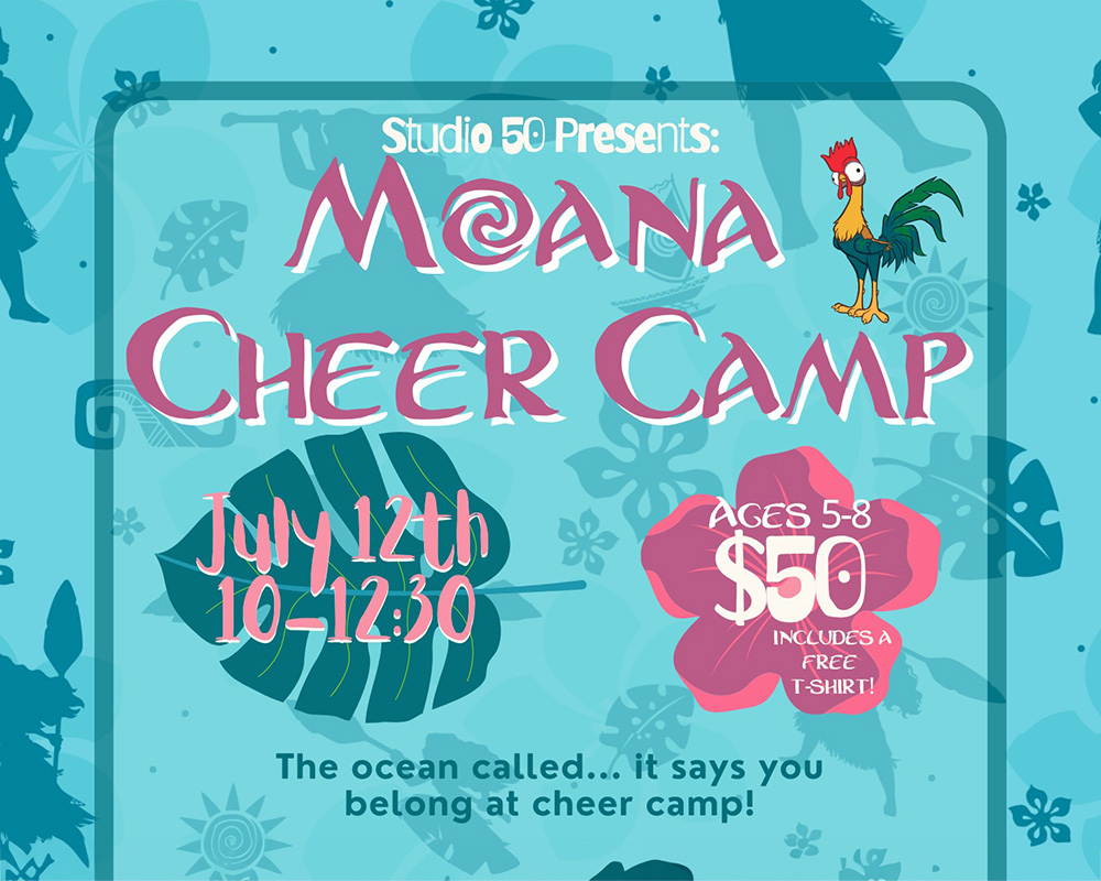 The ocean is calling... and it says YOU belong at cheer camp! Join us for an unforgettable Moana-themed cheer camp at Studio 50 and dive into the excitement! This fun-filled event will feature a Moana-inspired cheer routine, stunts, games, and plenty of joy! Date: 7/12/2025 Time: 10:00 am-12:30 pm Ages: 5-8 Cost: $50 (includes a...