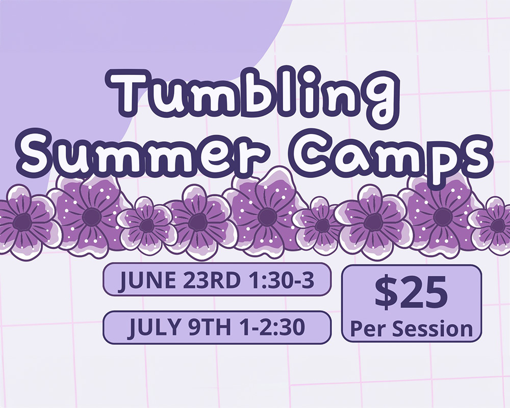 Get ready to flip, tumble, and take your skills to the next level with our Tumbling Summer Camps at Studio 50! These camps are designed for athletes who can kick over and/or pull up from their backbend and want to improve their tumbling technique. Date: 6/23/2025 Time: 1:30-3:00 pm Cost: $25